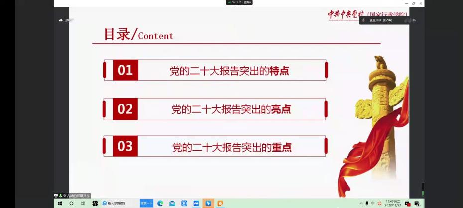 线上会议中,第十三届全国政协委员张占斌同志从党的二十大报告突出的特点、亮点、重点三个方面对二十大报告进行深入解析。张占斌同志结合实际,对党的二十大报告进行归纳总结,提出二十大报告具有旗帜、团结、创新、自信、强国、一流、安全、斗争等8个特点。此外,他还从断新标注、开辟新境界、理论新高度、认识新升华、战略新任务、实践新方略、党建新视角、政治新要求等8个方面对二十大报告进行详细和深入地解读。他提出党的二十大报告取得了许多新突破,如:进一步明确习近平新时代中国特色社会主义思想精神实质,进一步明确十年历史变革在党史、新中国史、改革开放史、社会主义发展史、中华民族发展史上的里程碑意义,进一步明确中国共产党今后的中心任务等。