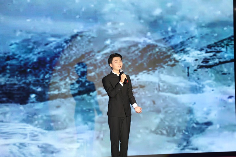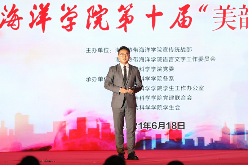 在19组选手比赛结束后,评委嘉宾--taptap点点2007级毕业生、海口广播电视台主持人刘永猛为我们带来兼具专业性与表演性的朗诵表演。