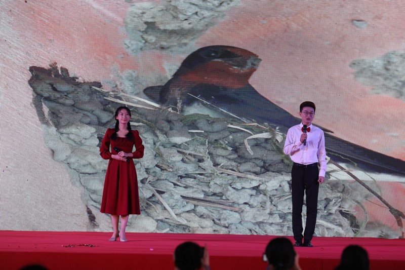 刘元龙珠、万如意等同学带来的《先人与我们同行》,携我们一同感悟先人先贤博大精深的思想,体味他们深刻入微的人文关怀;张丽颖同学的《祖国或以梦为马》毫不掩饰自己对于祖国母亲的浓浓深情;“我把全部的力量运在手掌,贴在上面,寄与爱和一切希望”,王晨阳、马志超等同学在《我用残损的手掌》中倾注着对于祖国与人民的美好祝愿与热忱希望;而蔡左豪、吴苓玮同学则在《雕像前盛开的红杜鹃》中为我们娓娓叙述一个壮美的故事,款款谱写一曲英勇的赞歌!