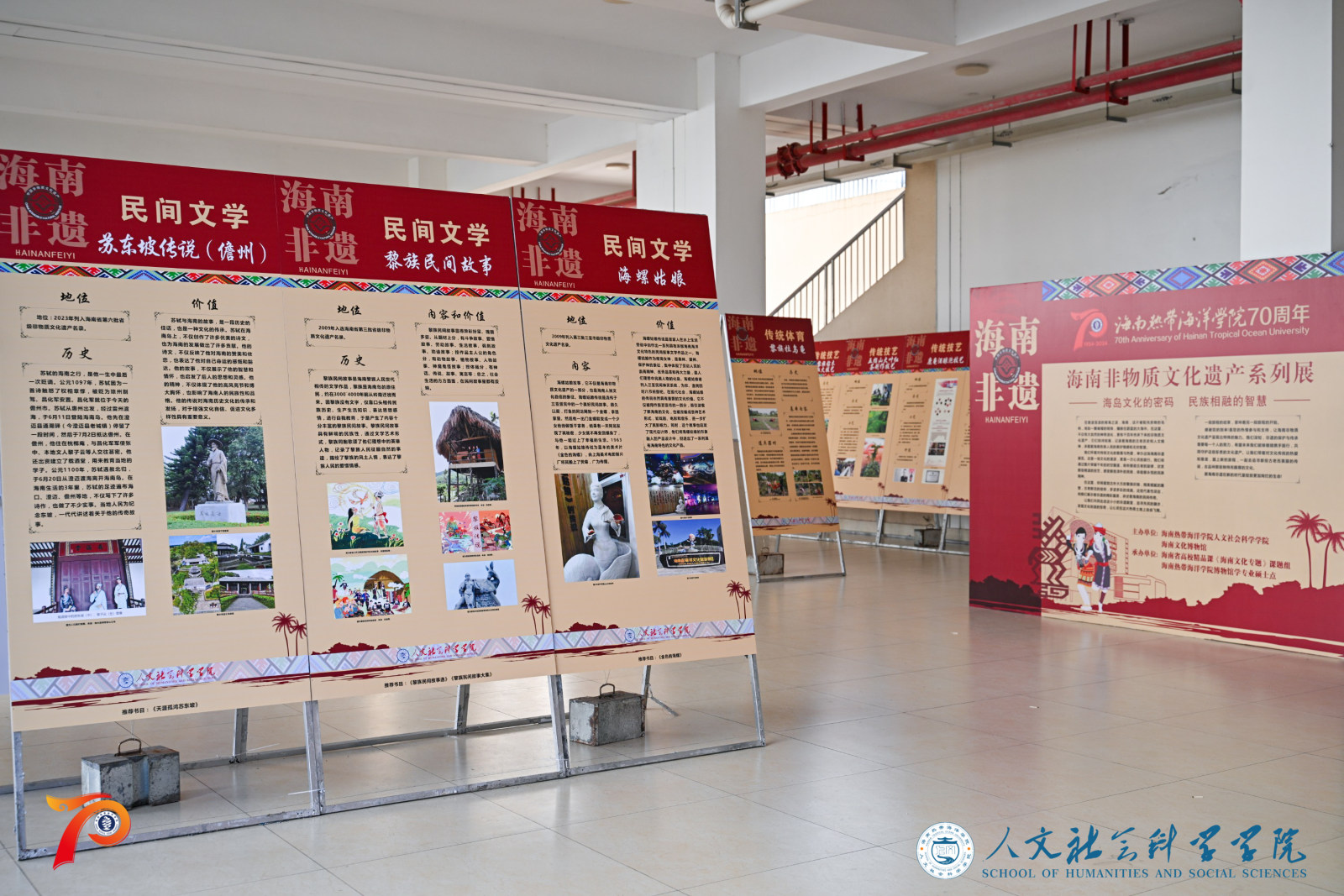 第二部分是由本校首届文物与博物馆专业研究生及其指导教师携手打造的海南非物质文化遗产系列展。展览深度探寻了海南本土非物质文化遗产,借助精巧构思的展板陈列,将海南非遗的独特韵致与深邃底蕴展露无遗。从古朴的黎族织锦工艺到神秘的苗族蜡染技法,从传统的椰雕匠心到热闹非凡的“三月三”民族节庆,每一项非遗都似在低吟海南这片热土的往昔传奇,传递先辈的聪慧情思,有力彰显公司于文化传承创新领域的使命担当与专业实力。